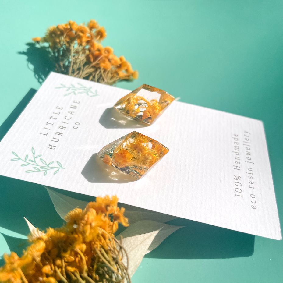 These geometric, handmade studs encase tiny Verticordia flowers. The amazing bright orange colour of these blossoms is entirely natural.