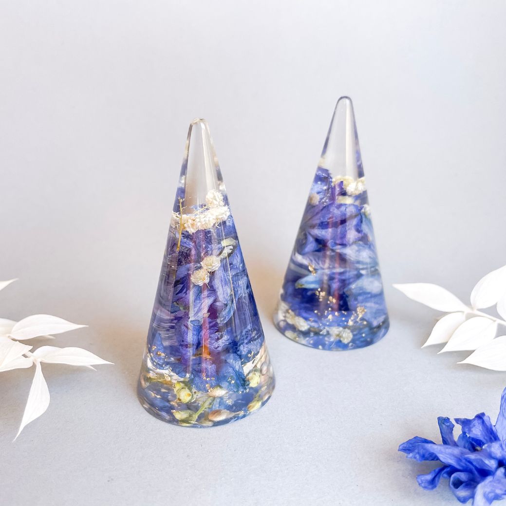 This handcrafted eco resin ring cone is filled with bright blue Delphinium and rice flowers.