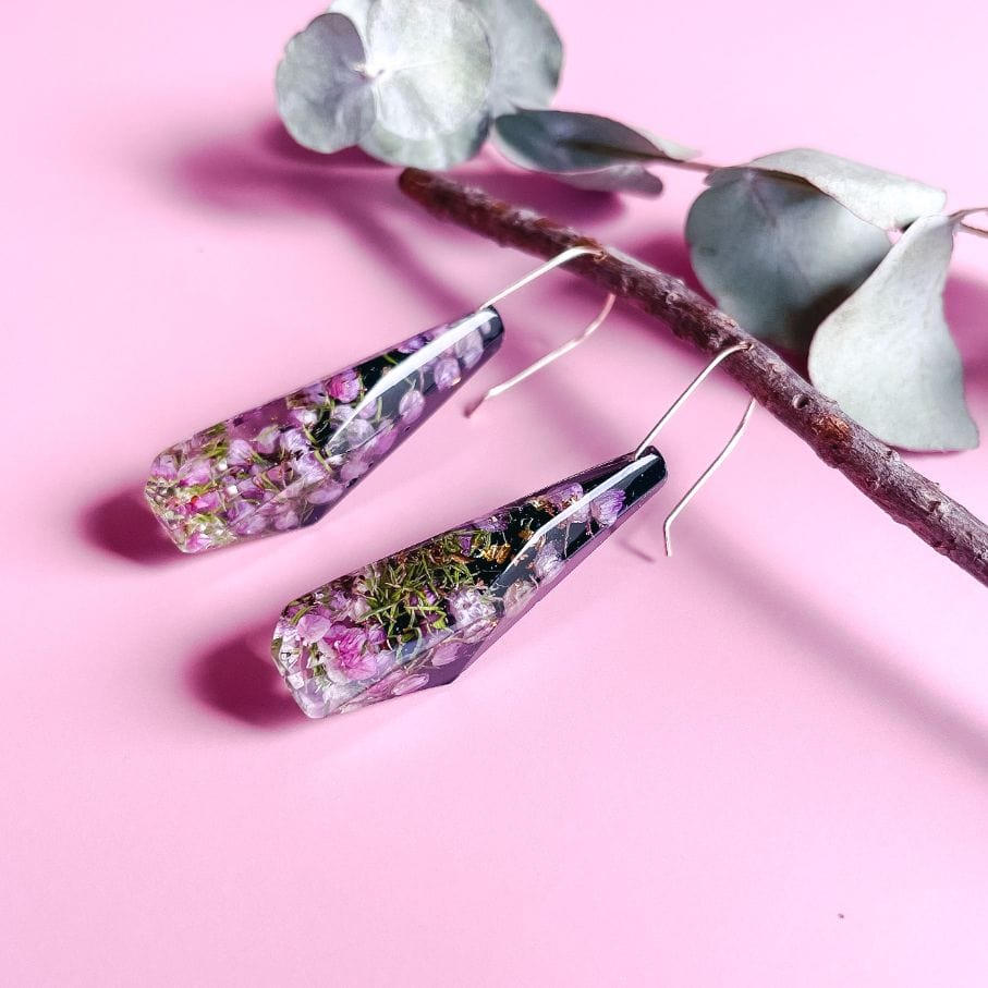 These geometric, handmade classic dangle earrings encase the tiny deep pink/purple heath flowers foraged locally and accentuated by a black background.