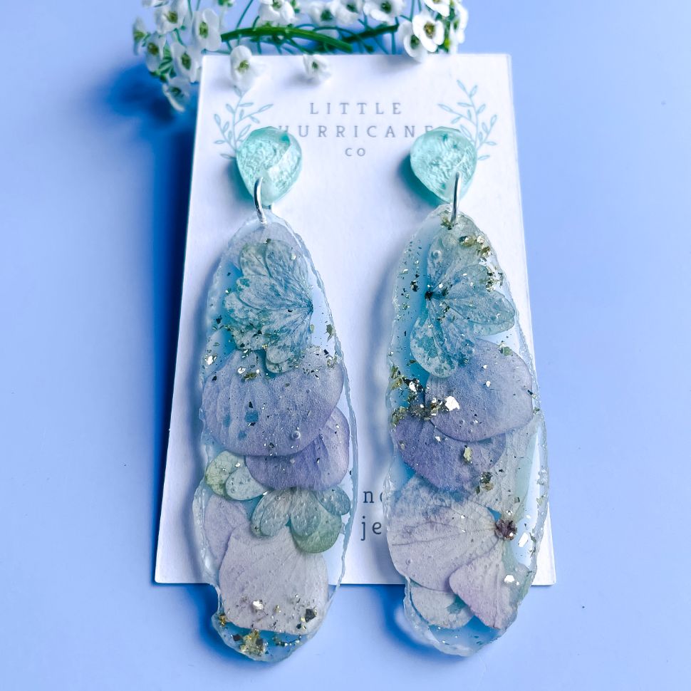 Handmade statement dangles encasing dreamy pink and blue Hydrangea petals paired with vintage baby blue studs.