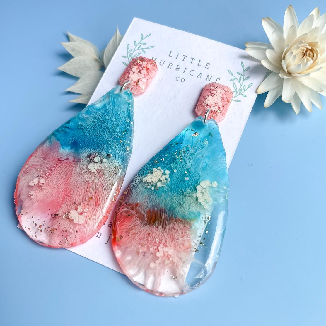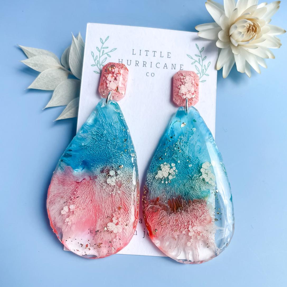 These are lovingly handmade in our home studio including creating our own organic shaped moulds, pouring resin and using alcohol ink to create this wonderful effect. The resin is left to cure for 2-3 days and is then removed sanded and drilled.