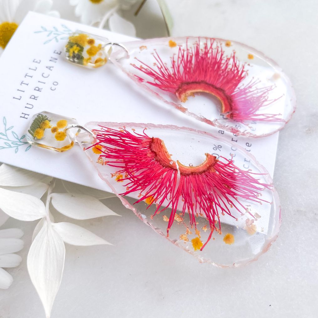 These handmade statement dangles encase the iconic Australian Gum blossom in a vivid dark pink matched with bright yellow Wattle blossoms.