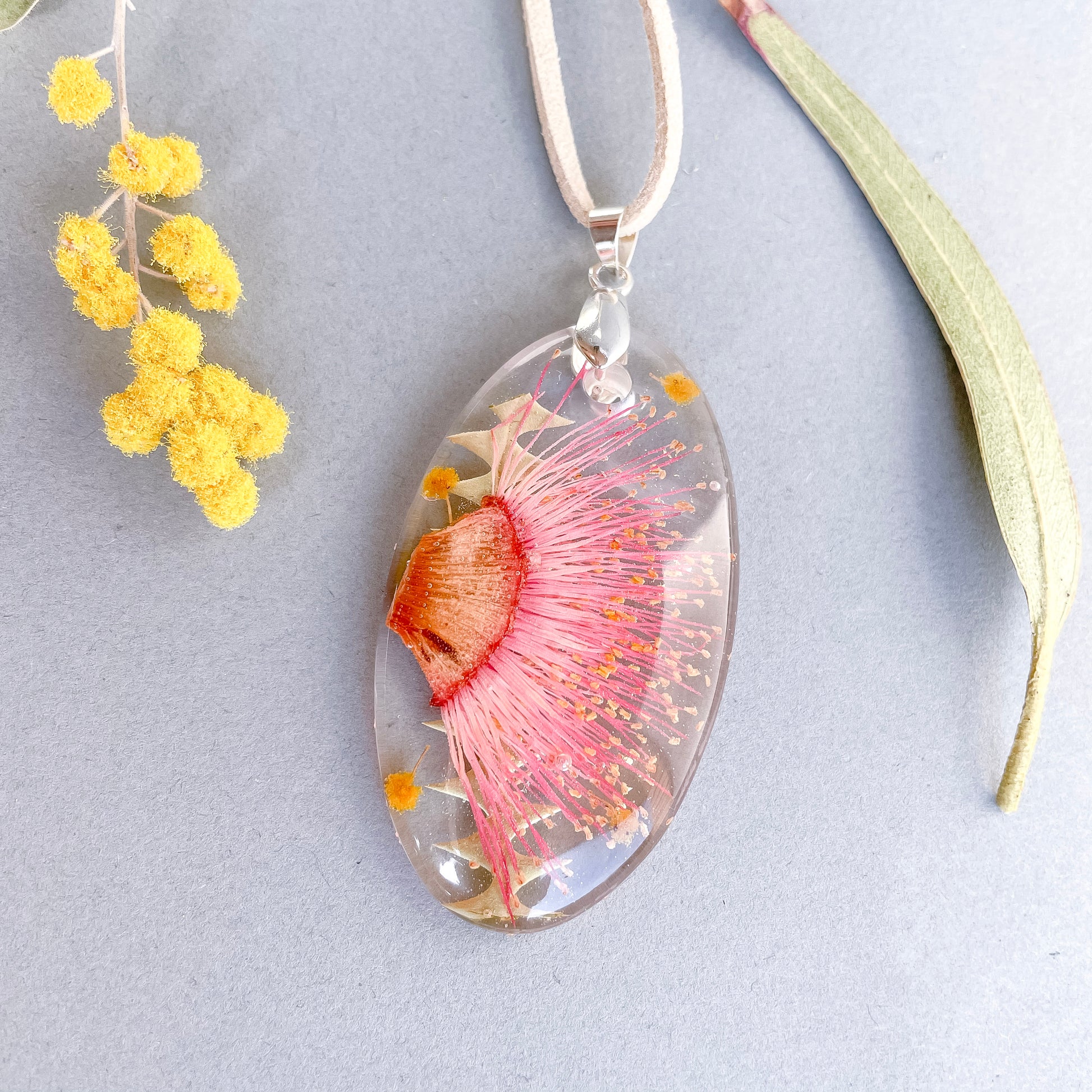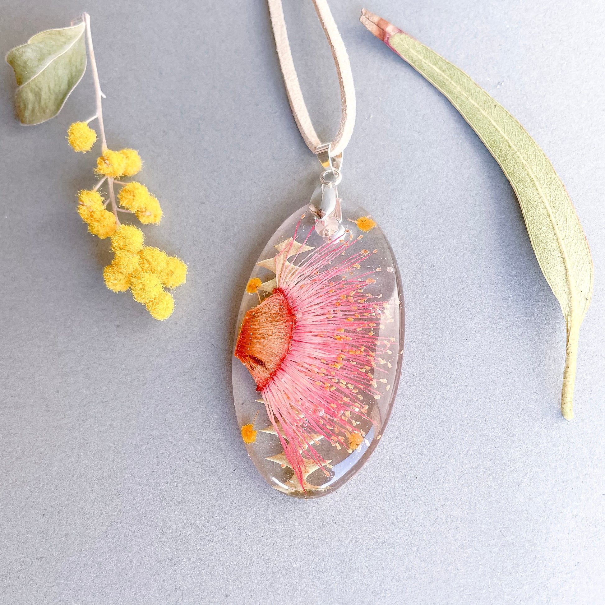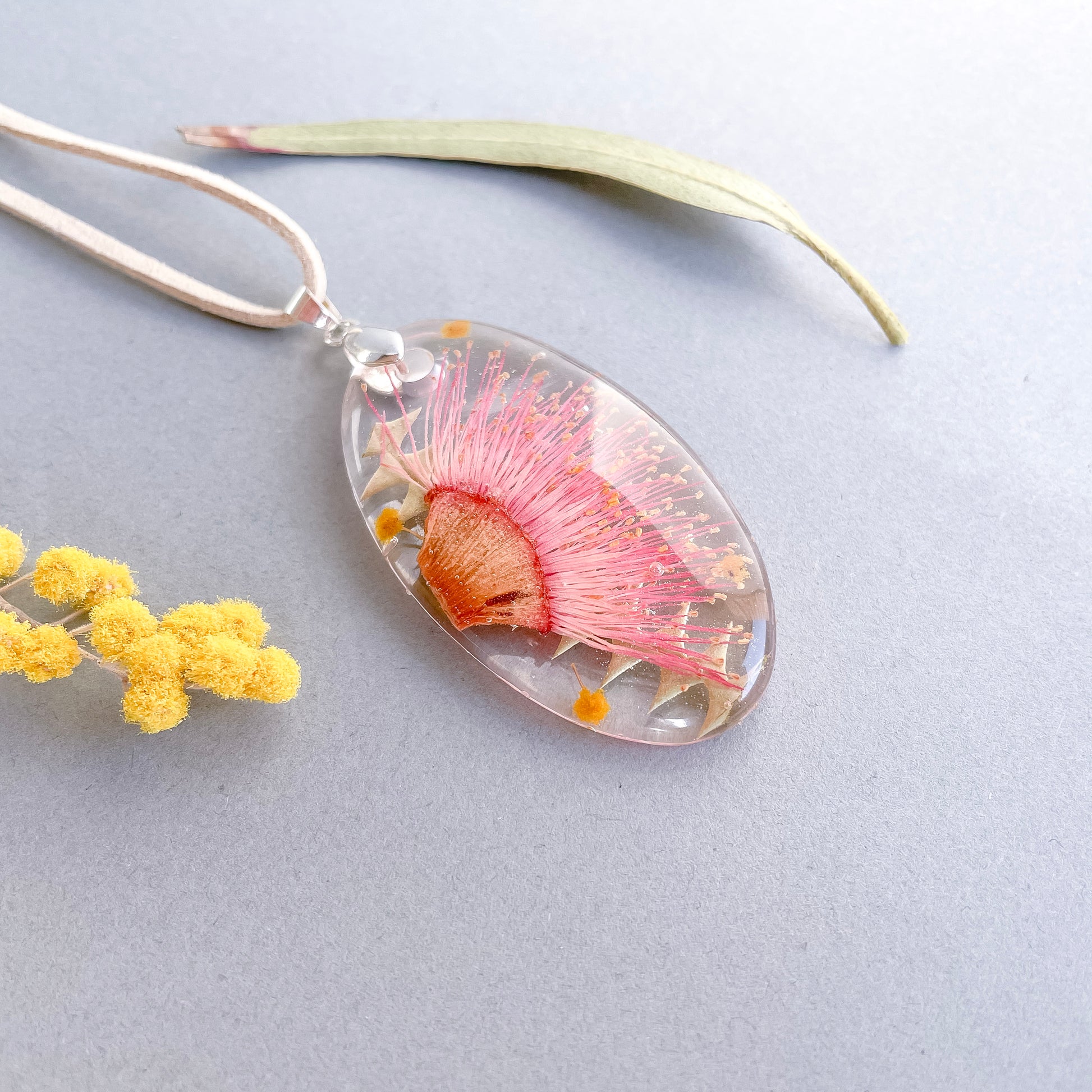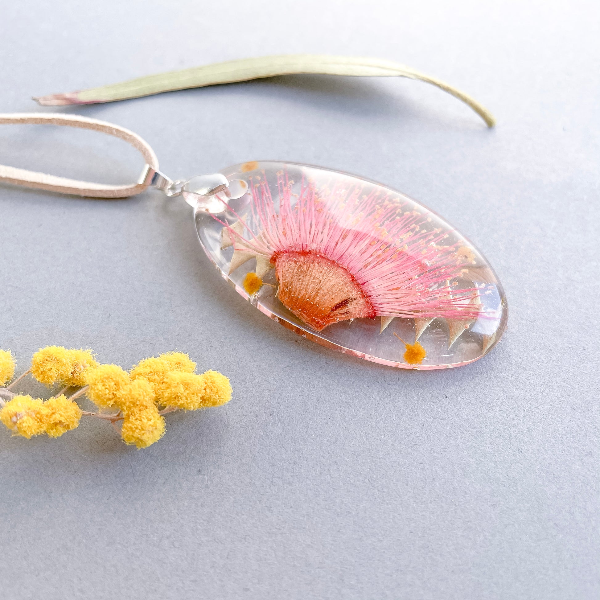 This handmade eco-resin necklace encases a pressed Gum blossom, Wattle and Banksia leaf foraged sustainably by the artist in Melbourne.