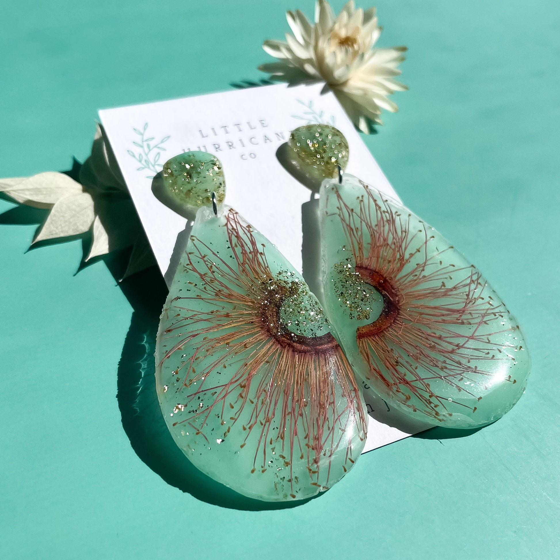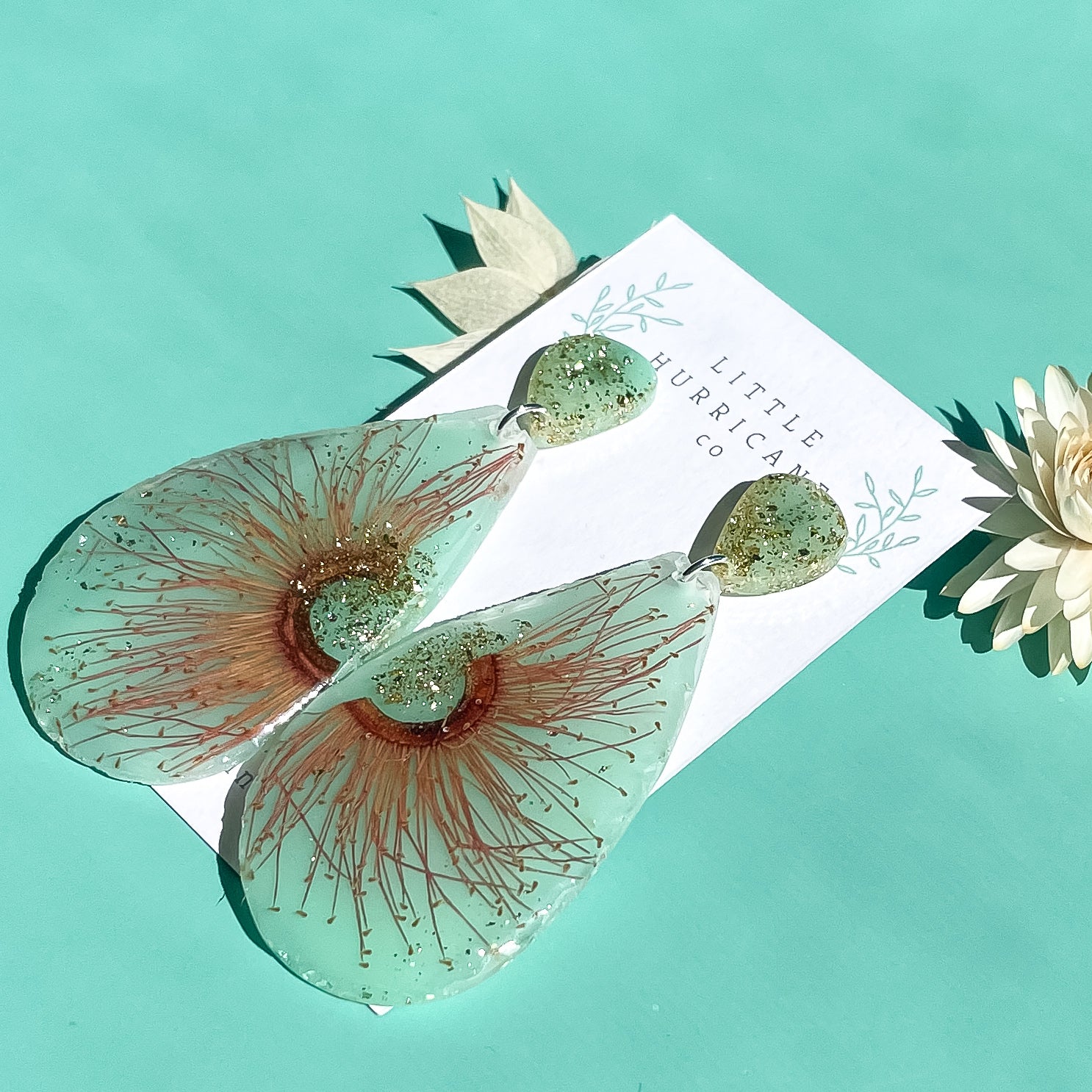 These handmade statement dangles encase two halves of the iconic Australian Gum in a an orange pink on a semi translucent minty aqua background.