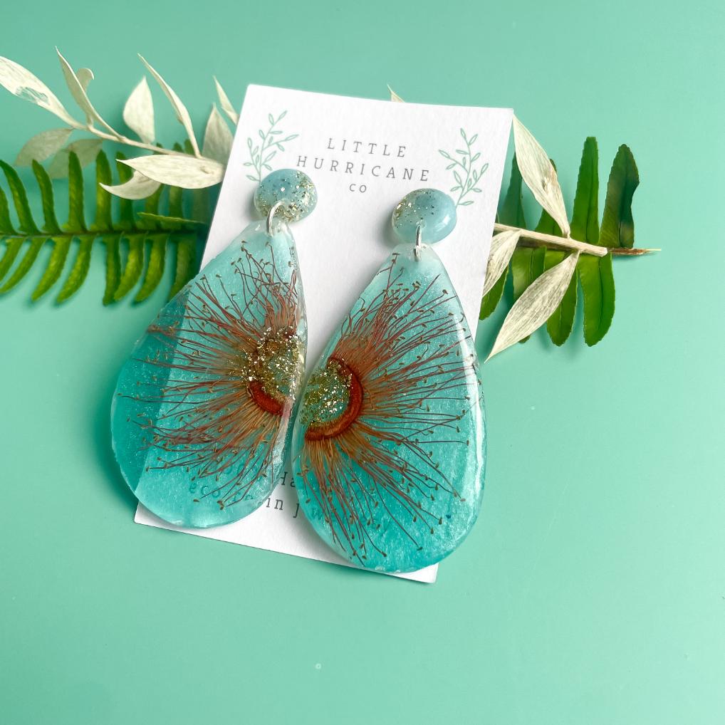 These handmade statement dangles encase two halves of the iconic Australian Gum blossom in an orange pink on a semi translucent aqua background.