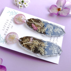 Handmade statement dangles encasing pieces of locally foraged Queen Anne's Lace.