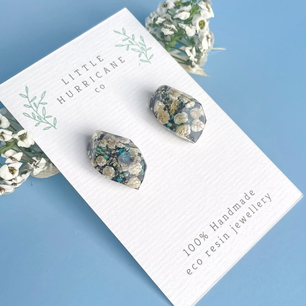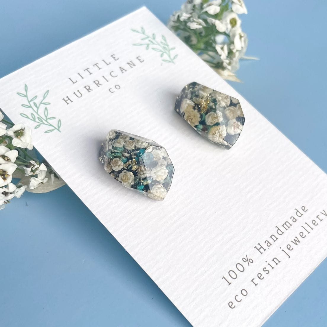 These handmade studs encase the tiny, native Australian thryptomene and home grown rice flowers on a striking black background.