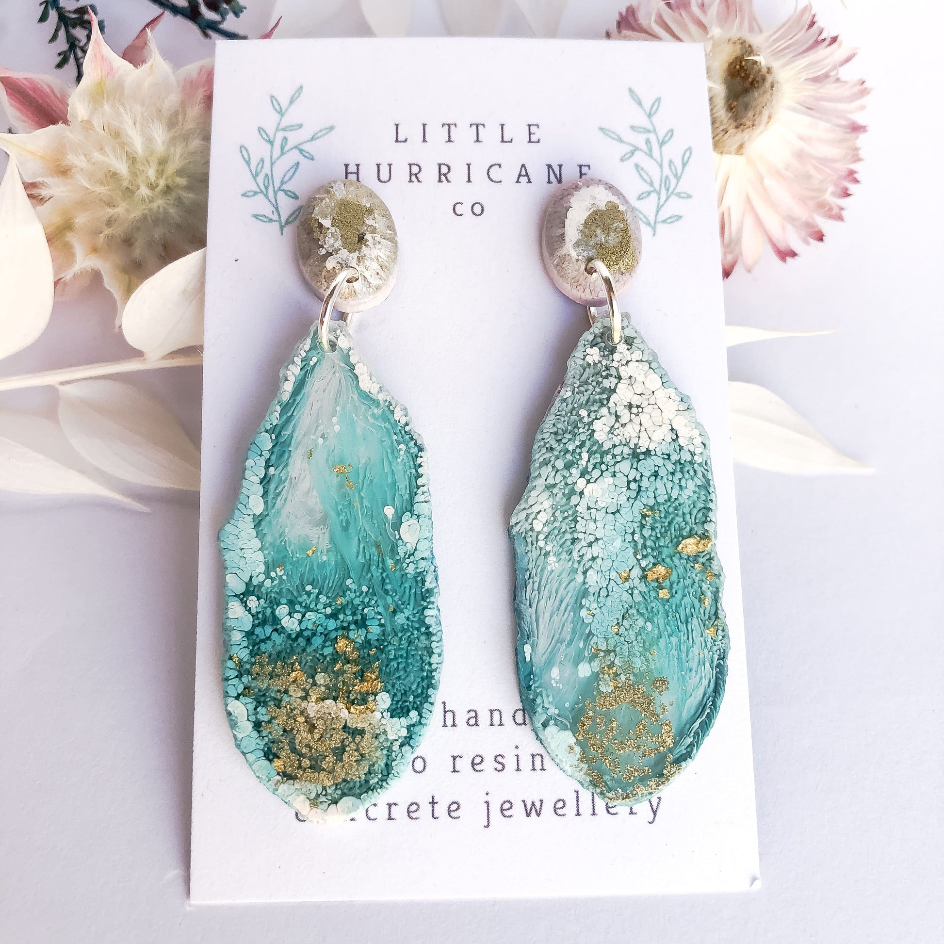 These are lovingly handmade in Melbourne including creating our own organic shaped molds, pouring resin and using alcohol ink to create this wonderful effect. The resin is left to cure for 2-3 days and is then removed sanded and drilled.