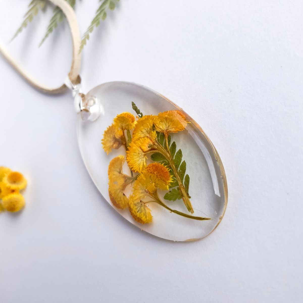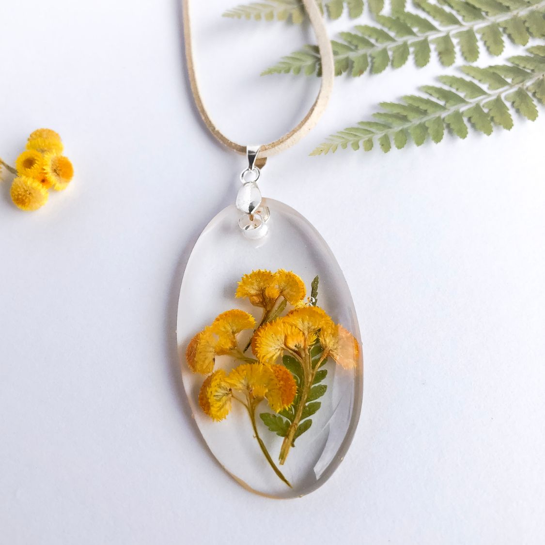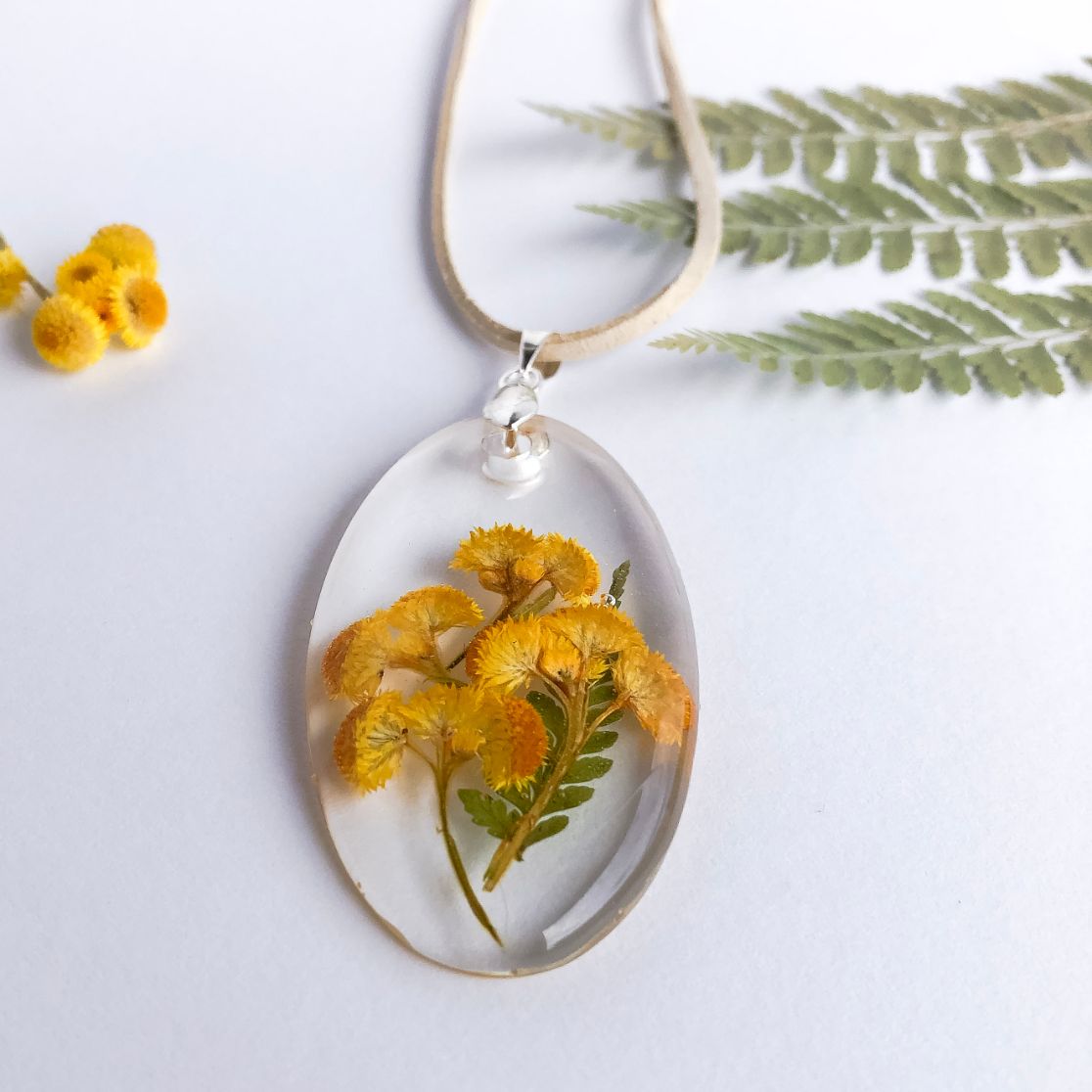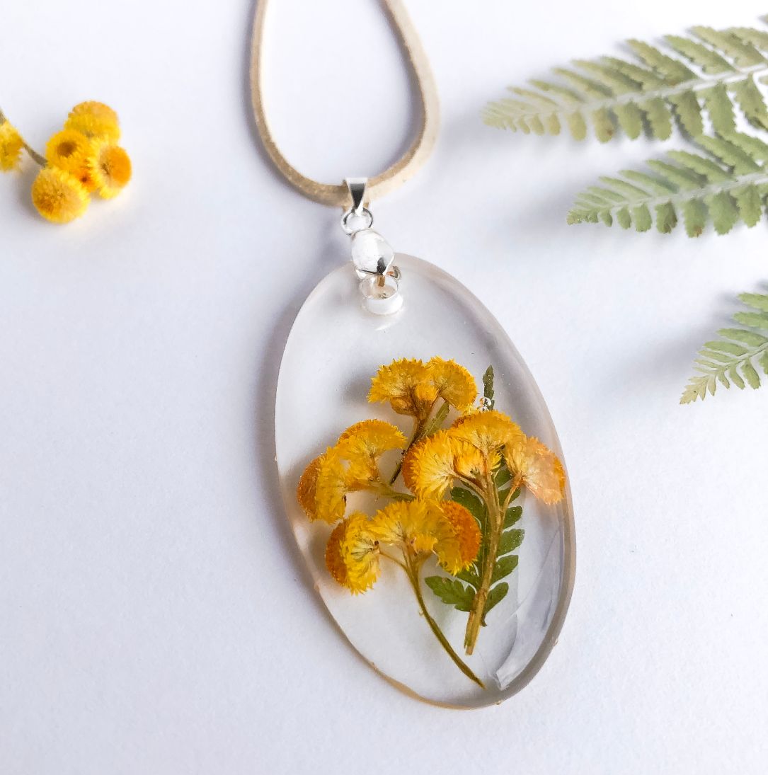 Sunny bright yellow buttons housed in crystal clear eco-resin, a piece of Australian native bushland preserved forever.
