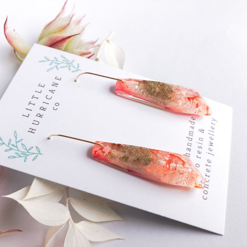 These are lovingly handmade in Melbourne. The resin is mixed and poured by hand using alcohol ink to create this wonderful effect. The resin is left to cure for 2-3 days and is then removed sanded and drilled.