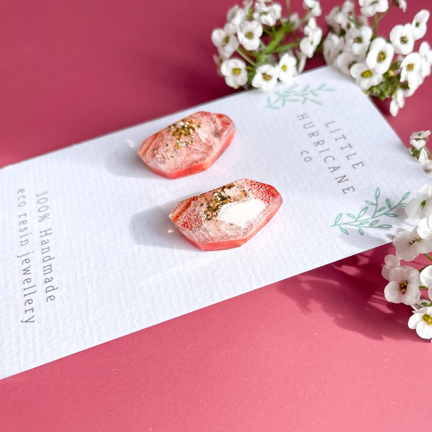 These are lovingly handmade in Melbourne.  The resin is mixed and poured by hand using alcohol ink to create this wonderful effect.  The resin is  left to cure for 2-3 days and is then removed sanded and drilled.