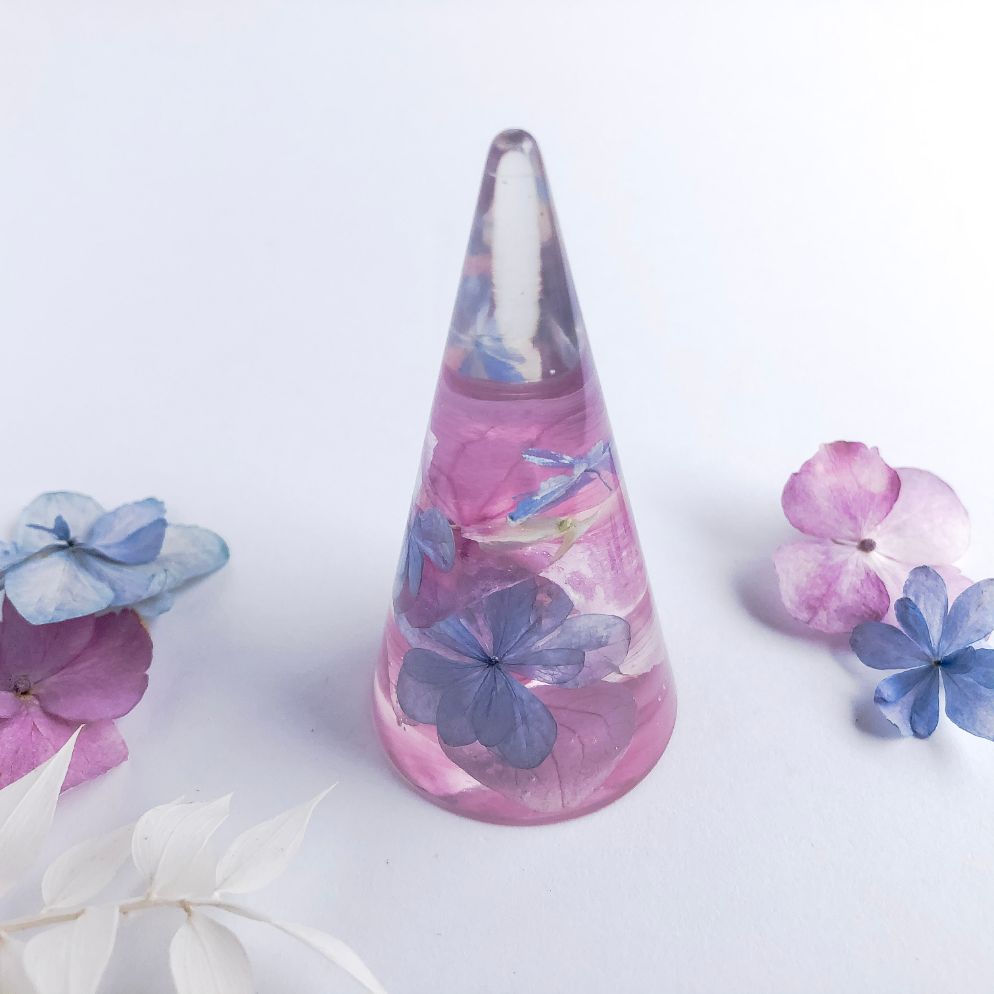 This handcrafted eco resin ring cone is filled with home grown Hydrangea flowers.