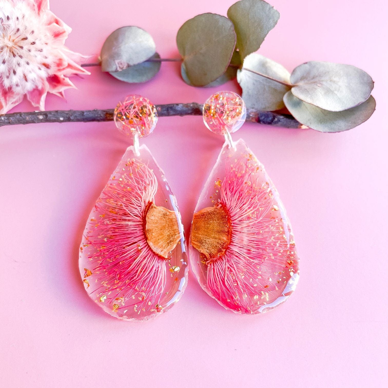 These handmade statement dangles encase pressed Australian Gum blossoms in an explosion of bright pink. These were locally foraged near our studio.