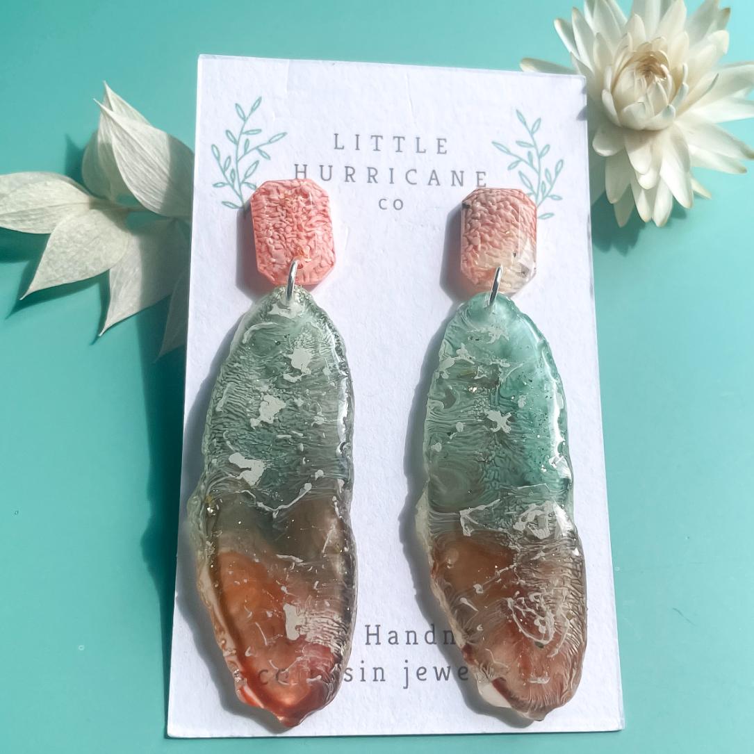 These are lovingly handmade in Melbourne including creating our own organic shaped moulds, pouring resin and using alcohol ink to create this wonderful effect. The resin is left to cure for 2-3 days and is then removed sanded and drilled.
