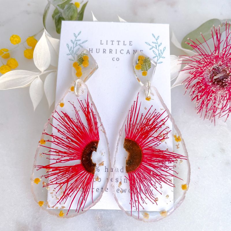 These handmade statement dangles encase the iconic Australian Gum blossom in a vivid red/dark pink matched with bright yellow Wattle blossoms.