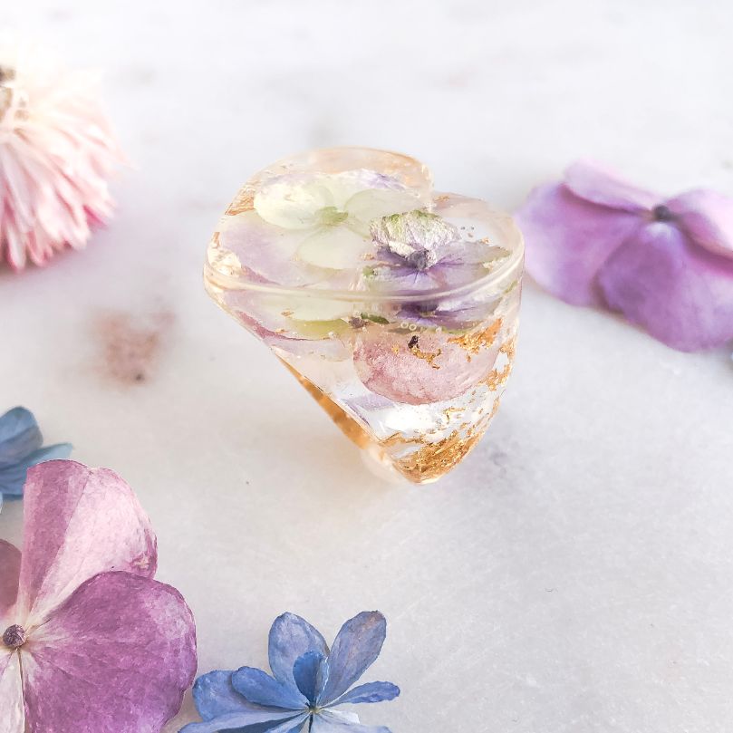 This handmade clear Statement Heart Ring, encases perfect tiny hydrangea flowers - suspended in eco-resin- with highlights of tiny flecks of gold leaf.